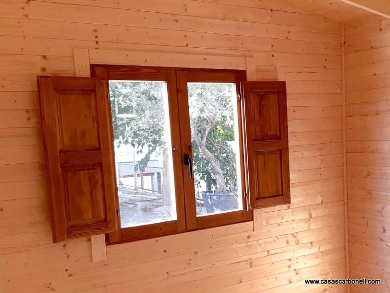 Ventanas de pino, con cierres metálicos y cristales de 5 mm con contraventanas interiores. Puertas interiores chapadas en melanina color roble o haya.
