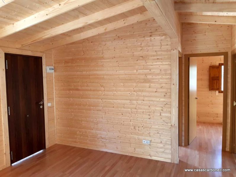 - Fabricación modular en paredes macizas de 60 mm. aprox. de frisos abeto nórdico, acabado rustico