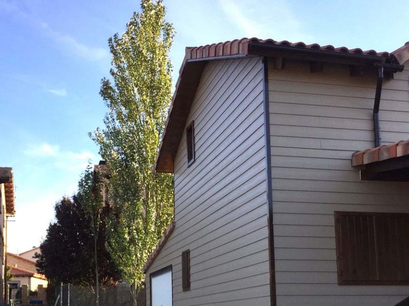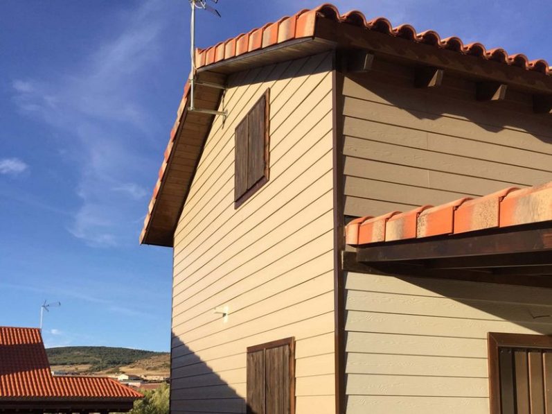 - Revestimiento exterior friso abeto nórdico modelo D 146×24, color teca satinado.