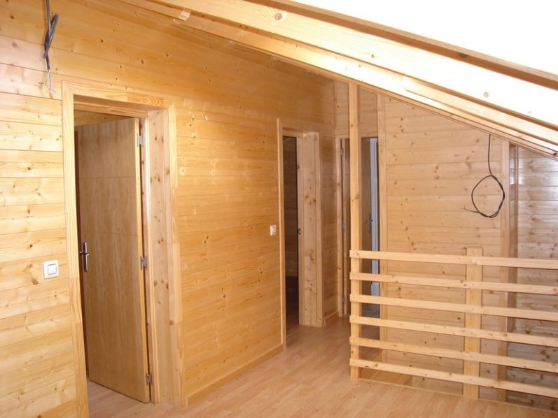 Se realizan las tabiquerías interiores con un de soporte un tablero estructural de 18 mm, al que se encola y clava un friso de abeto de 19 mm. por ambas caras.